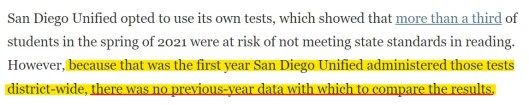 What the author neglected to realize is that 2021/2022 was ALSO the first year San Diego Unified administered those tests district wide since the test was SBAC Short Version.