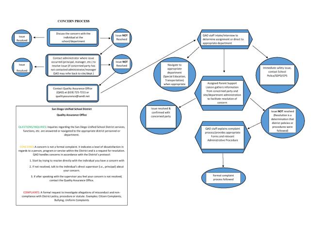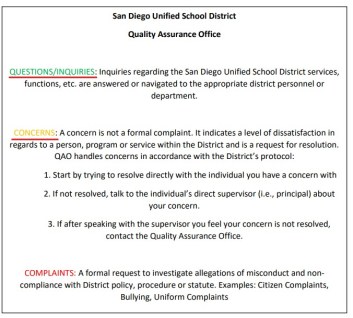 A great example of this dishonest SDUSD scam to prevent complaints from being addressed is the ridiculous “Quality Assurance Department” (QAO) flow chart that is prefaced by trying to diverting MAJOR SDUSD violations to a downgraded local school site “question/inquiry” or undefined “concern” category underlined in red below: