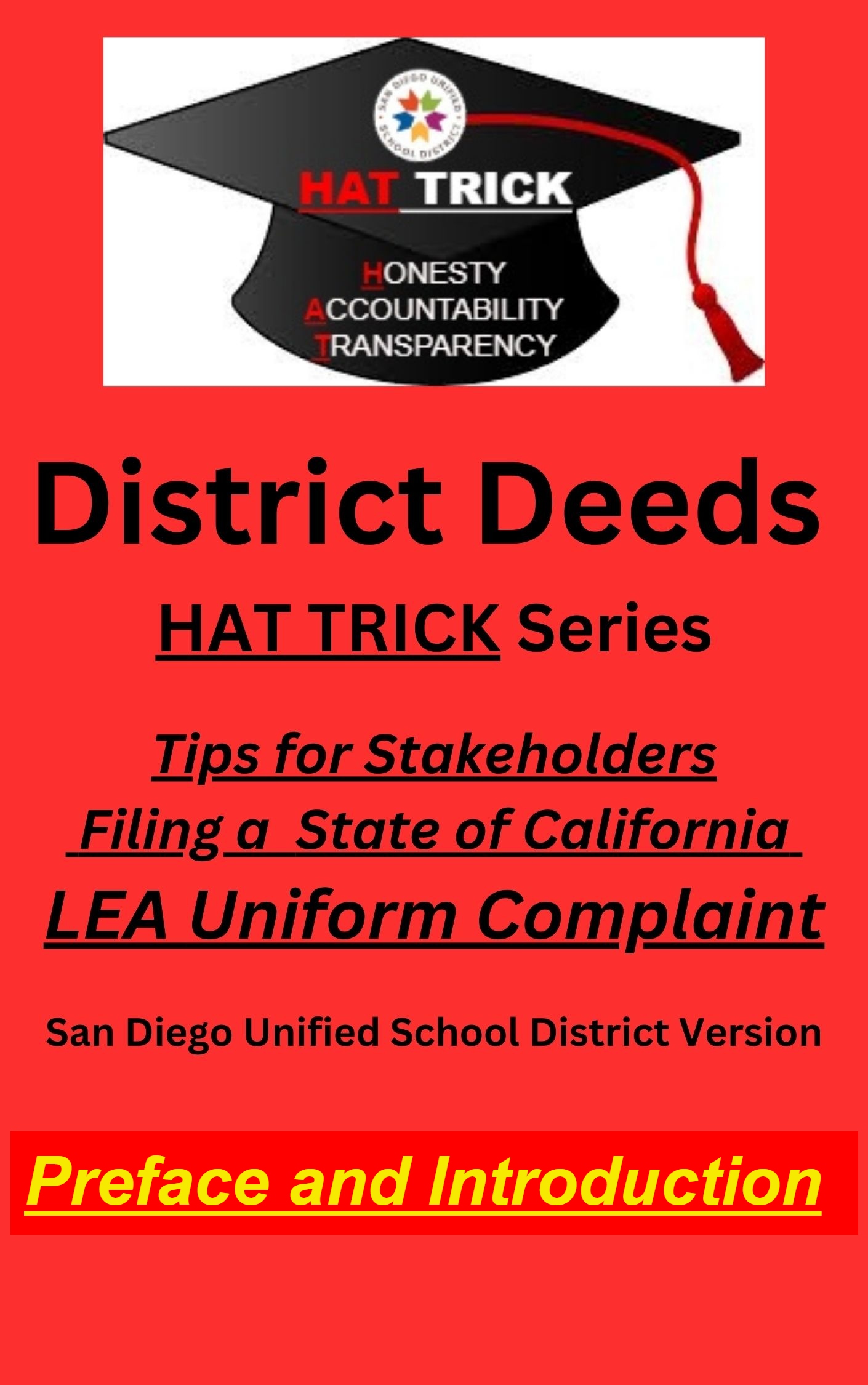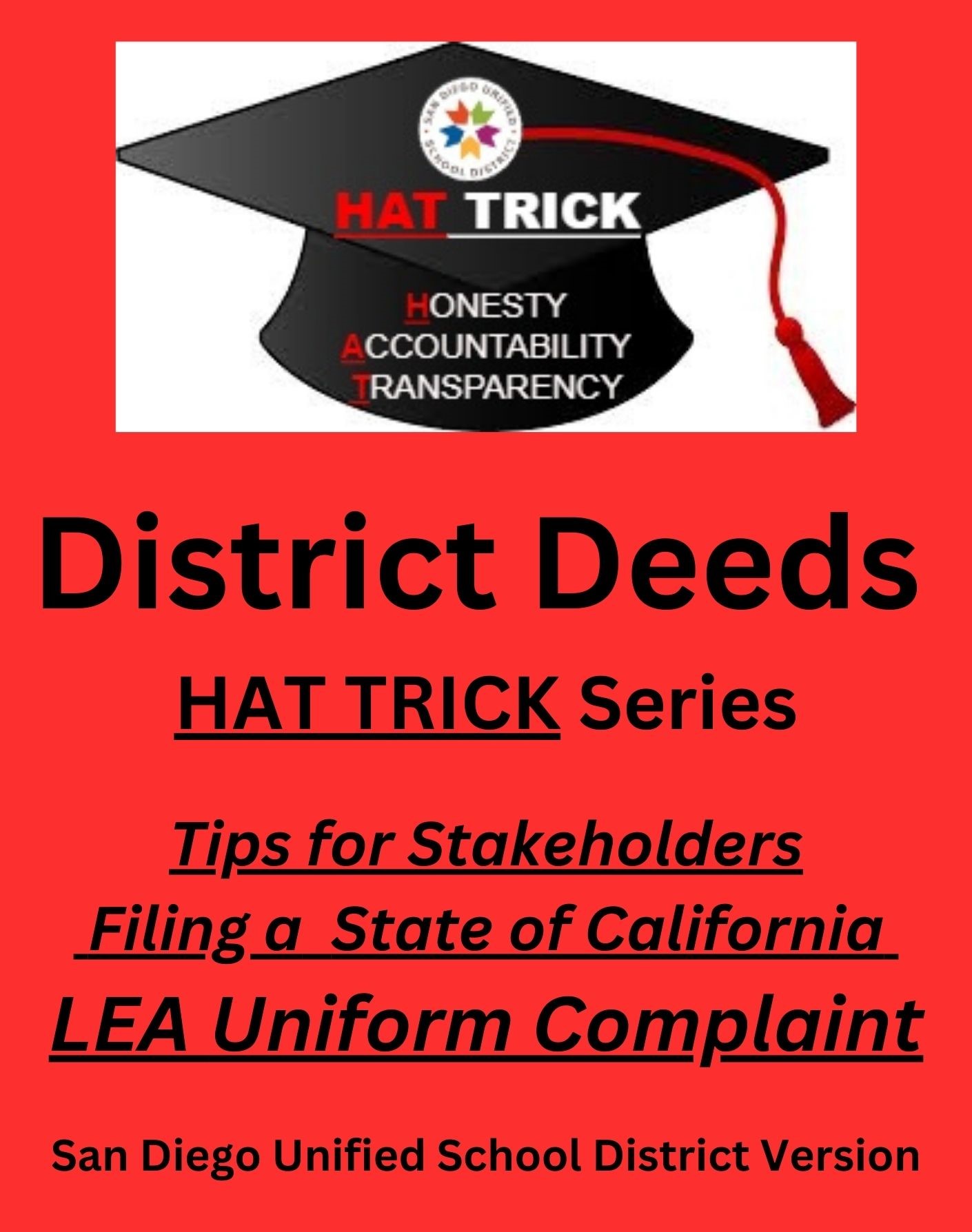 For that edict, today we are presenting the first handbook in the District Deeds HAT TRICK Series titled “Tips for Stakeholders Filing a State of California LEA Uniform Complaint – San Diego Unified School District Version”