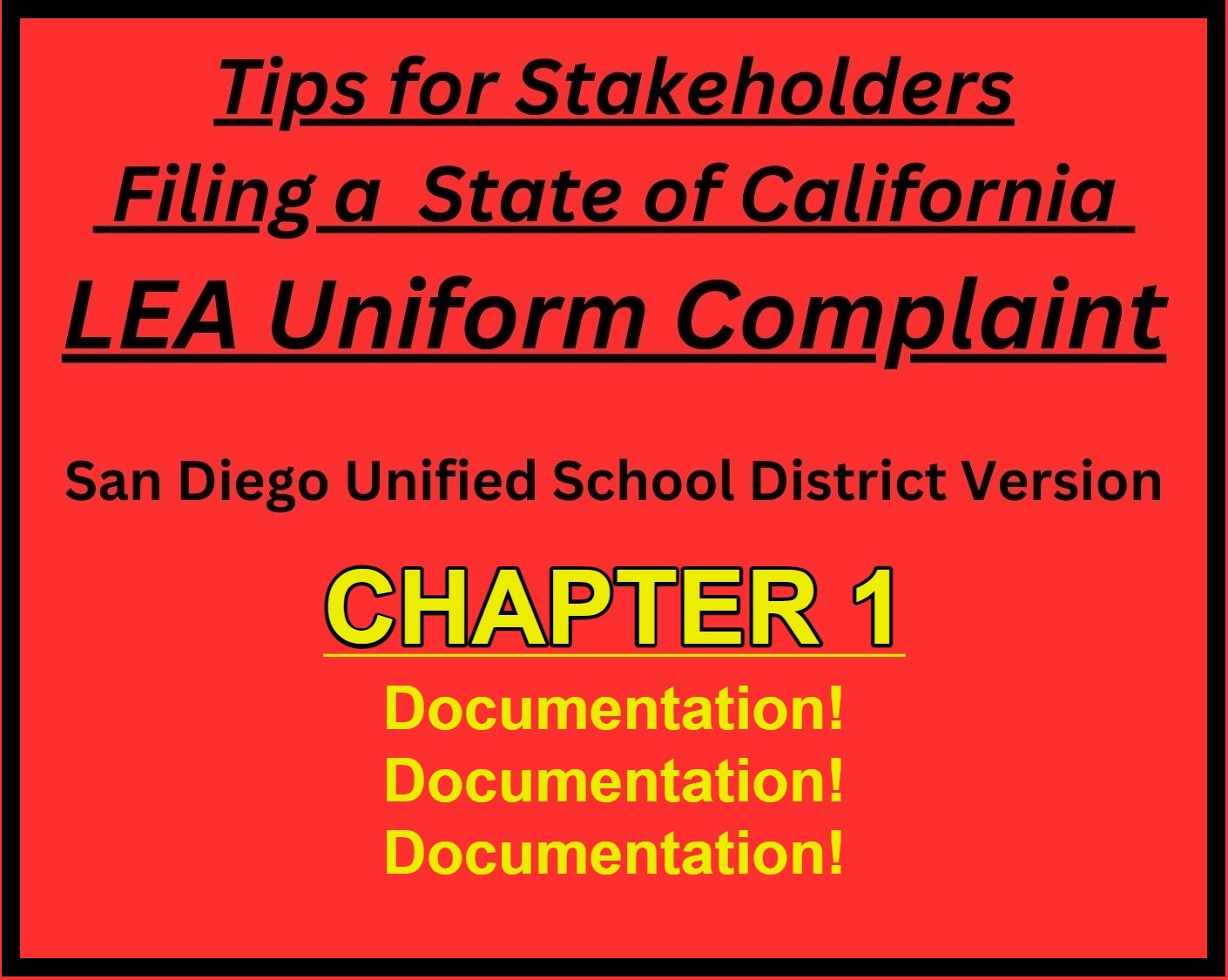 This week we continue with our 2023 HAT Trick Resolution of holding the San Diego Unified School District to FULL Honesty, Accountability, Transparency with Chapter 1 of the District Deeds HAT TRICK Handbook Series titled “Tips for Stakeholders Filing a State of California LEA Uniform Complaint – San Diego Unified School District Version – DOCUMENTATION! DOCUMENTATION! DOCUMENTATION!”.