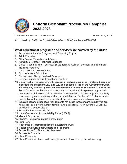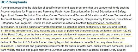 The closest we get to full UCP disclosure is from a post published on the Lozano/Smith LLP website titled “New Regulations Regarding Uniform Complaint Procedures Took Effect July 1, 2020“. A number of key items are listed on this post: