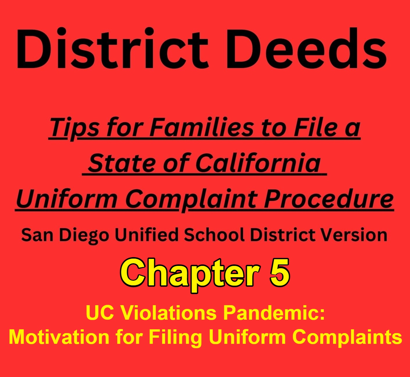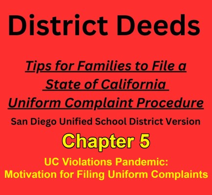 This week we continue with our 2023 HAT Trick Resolution of holding the San Diego Unified School District (SDUSD) to FULL Honesty, Accountability, Transparency with the District Deeds HAT TRICK Handbook Chapter 5: “UC Violations Pandemic: Motivation for Filing Uniform Complaints”.