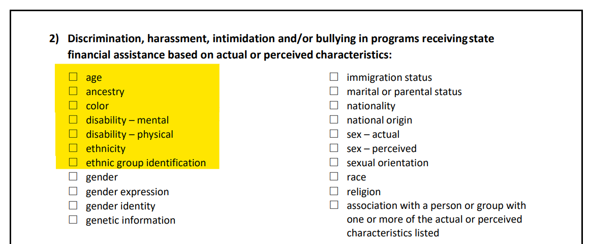 DD TIP: Remember—ALL of the following categories must be VIOLATIONS of question 2 – “Discrimination, harassment, intimidation and/or bullying in programs receiving state financial assistance based on actual or perceived characteristics”