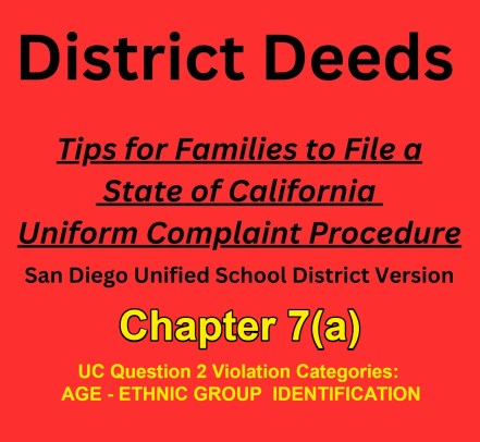Next week in Chapter 7(b) we will clearly define and break down UC Question 2 Violation Categories “Gender” through “National Origin”. Be sure to pass this on to ALL your SDUSD Stakeholder friends and colleagues for ALL chapters.