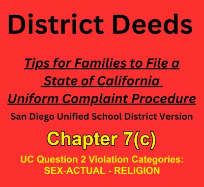 Next week in Chapter 7(d) we will clearly define and break down the final UC Question 2 Violation Category “association with a person or group with one or more of the actual or perceived characteristics listed”. Be sure to pass this on to ALL your SDUSD Stakeholder friends and colleagues for ALL chapters.