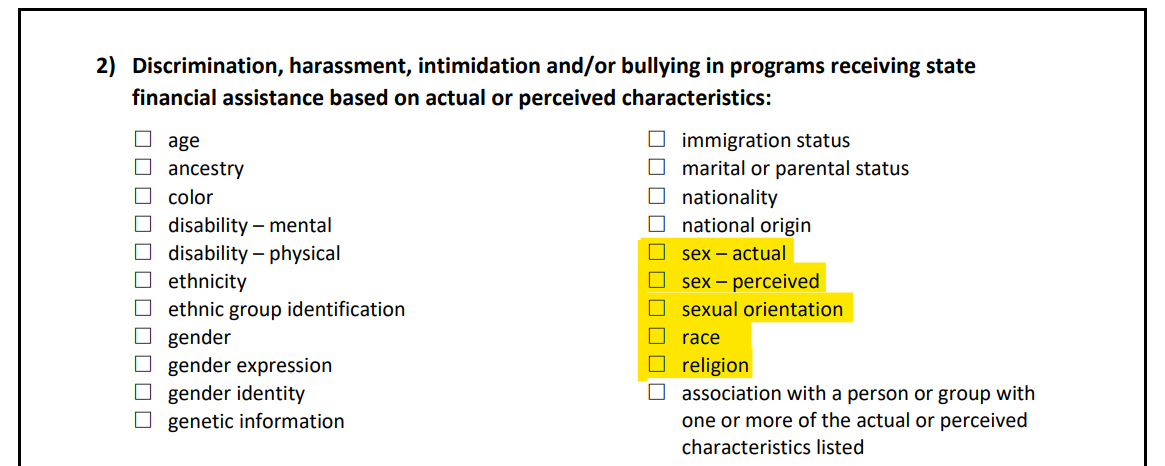 DD TIP: Remember—ALL of the UC categories must be VIOLATIONS of question 2 – “Discrimination, harassment, intimidation and/or bullying in programs receiving state financial assistance based on actual or perceived characteristics”. Many individuals suffer those discrimination, harassment, intimidation and sexual harassment in MULTIPLE UC categories at the same time.
