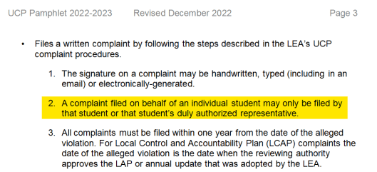 But be aware that there are specific restrictions outlined in the California Department of Education (CDE) Uniform Complaint Procedures Pamphlet 2022-2023: