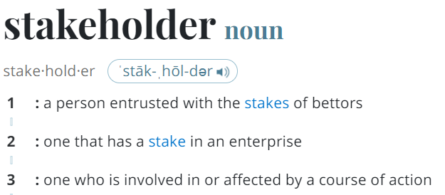 ALL San Diego and California citizens have an “association” with the SDUSD under that definition through the local, state and federal taxes they pay to support public education. That financial contribution also makes them “stakeholders” of the SDUSD. Here is the definition of “stakeholder” from the Webster Dictionary: