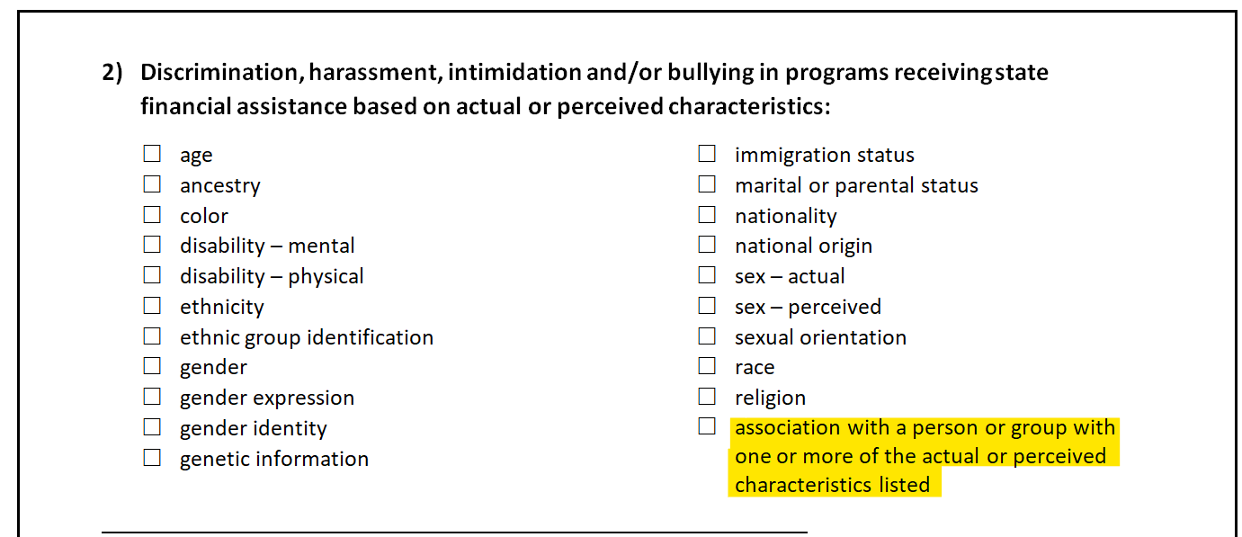 DD TIP: Remember—ALL of the UC categories must be VIOLATIONS of question 2 – “Discrimination, harassment, intimidation and/or bullying in programs receiving state financial assistance based on actual or perceived characteristics”. Many individuals suffer those discrimination, harassment, intimidation and sexual harassment in MULTIPLE UC categories at the same time.
