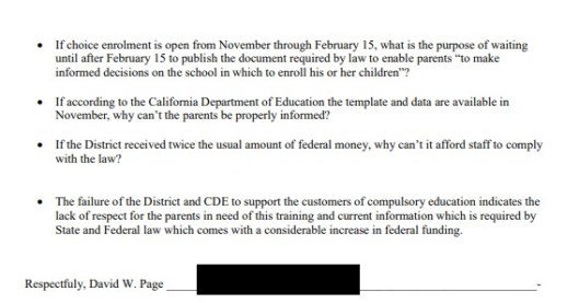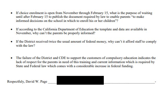 We contacted David Page, former Chair of the SDUSD District Advisory Committee to get a sample of the many Uniform Complaints he has filed against both the CDE and the SDUSD. He responded with the following narrative section: