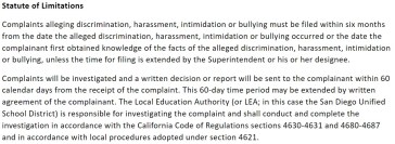 Please note that the only stipulation, outside of the following “Statute of Limitations”, is that your complaint is provided “in writing“. This means you can frame your UC in any way you see fit, using the SDUSD provided form or not.