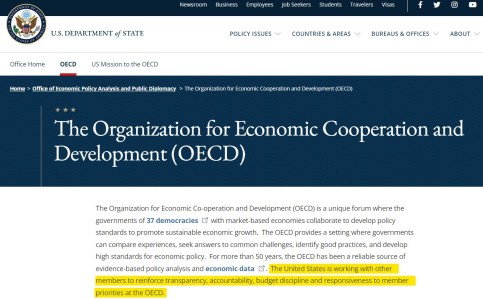 And TRANSPARENCY is not just an overriding feature in the United States government domestically. TRANSPARENCY is also infused in its foreign policy worldwide by the U. S. Department of State in its membership in The Organization for Economic Cooperation and Development (OECD):