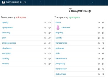The following is from Thesaurus Plus listing the Antonyms and Synonyms for the word “TRANSPARENCY”: