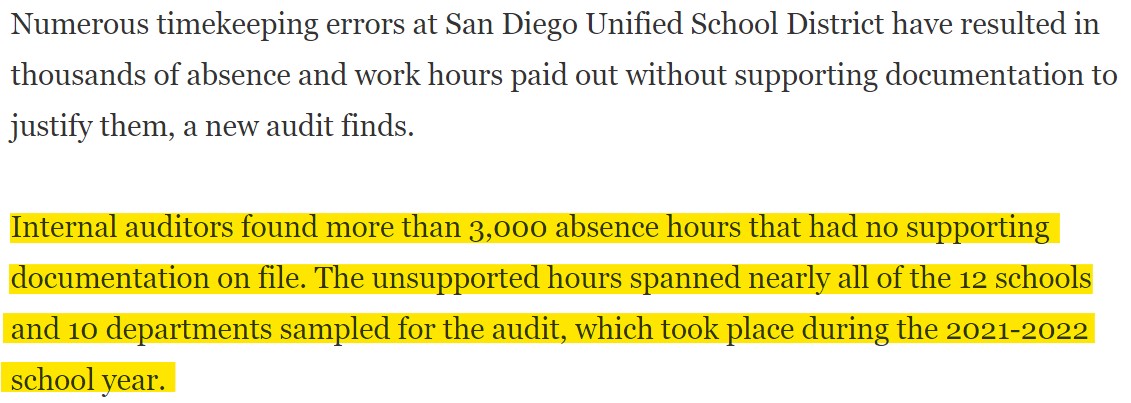 Taking away all of these politically correct phrases like “no supporting documentation” and “unsupported hours” and “inefficient timekeeping setup” for the powerful and highly educated $1.4 billion SDUSD can be boiled down to 4 words: