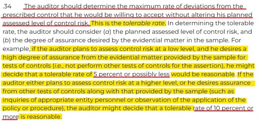 As indicated above according to the PCAOB, “to assess control risk at a low level” a “tolerable rate of 5 percent or possibly less” is acceptable but if the item being audited needs to be assessed “at a higher level”, then a “rate of 10 percent or more is reasonable”.