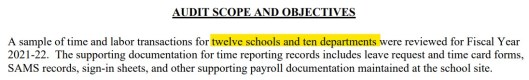 End result: 19,000 active employees and 13,000 salaried employees are employees but the “Audit Scope” only mentions the number of schools and departments that were audited but not the total number of actual schools and departments they were selected from.