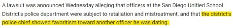 The potential breech of this SDUSD Police “Code of Ethics” was exposed in a recent lawsuit by members of the SDUSD Police Department regarding a relationship between the SDUSD Police Chief and a SDUSD Police Sergeant. Here is an excerpt from Channel 7 San Diego titled “Lawsuit alleges San Diego school police chief’s relationship allowed favoritism, corruption”