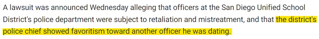 The potential breech of this SDUSD Police “Code of Ethics” was exposed in a recent lawsuit by members of the SDUSD Police Department regarding a relationship between the SDUSD Police Chief and a SDUSD Police Sergeant. Here is an excerpt from Channel 7 San Diego titled “Lawsuit alleges San Diego school police chief’s relationship allowed favoritism, corruption”