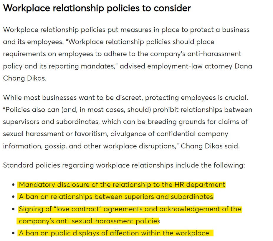 An informative article regarding the risks and damages of NOT having an established workplace policy is outlined in an article from Business News Daily titled “How to Manage Workplace Relationships”