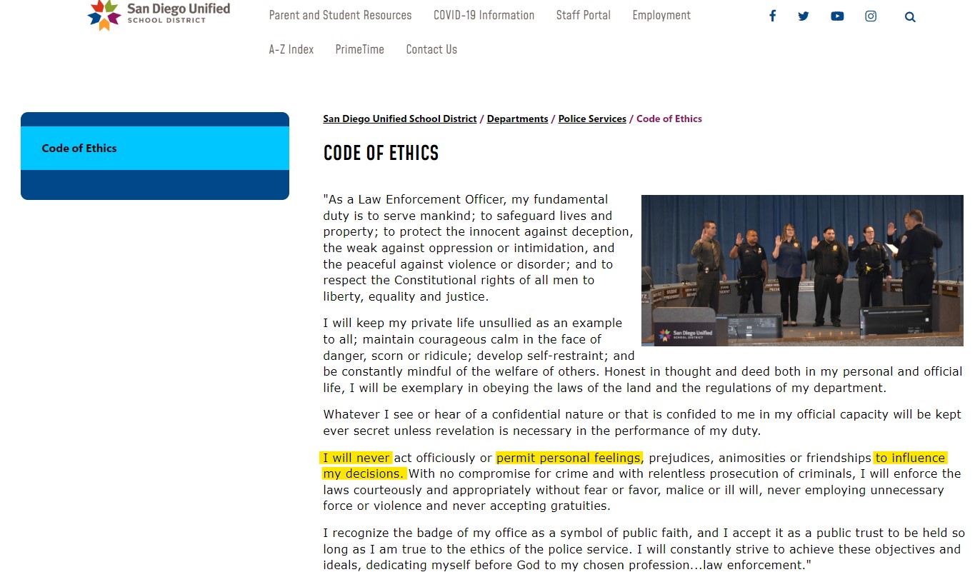 The second “Code of Ethics” is related to the SDUSD Police Department listed below: