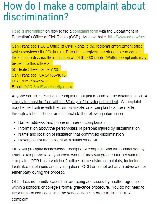 - If you still get no timely (3 days) or viable response from the SDUSD, use the following instructions from the Legal Services for Children website and talk to the San Francisco OCR directly: