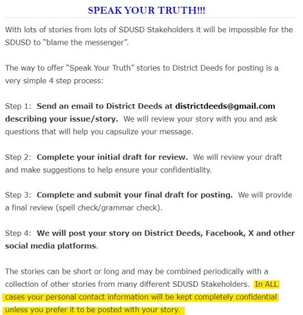 “Speak Your Truth” CONTINUES to inspire honesty and bravery with SDUSD Teachers, Staff, Parents and Students and given us additional insight into the deep fear of SDUSD retribution by employees in the toxic SDUSD work environment.