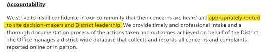 Guess who the “District leadership” is that your “concerns are heard and appropriately routed to“? The “District Leadership” that will FIGHT for your rights and, as the SDUSD “Accountability” description says will “instill confidence in our community that their concerns are heard“.