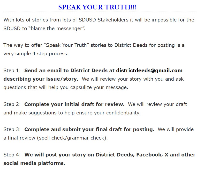 - You have an important story regarding San Diego Unified School District corruption or misdeeds, please e-mail your information to us at districtdeeds@gmail.com
