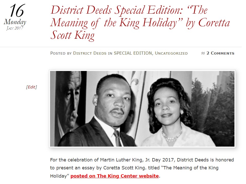 District Deeds Special Edition: “The Meaning of the King Holiday” by Coretta Scott King